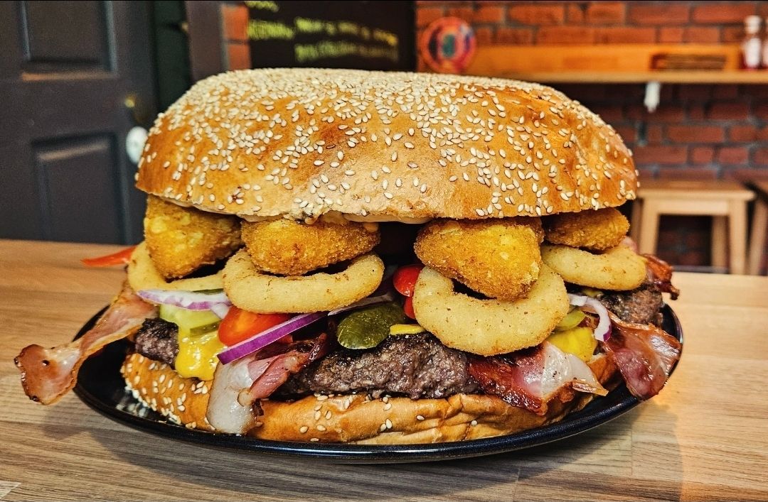 z podwójnym mięsem, sałatą, podwójnym serem, podwójnym boczkiem, pomidorem , ogórkiem, cebulą i sosem -